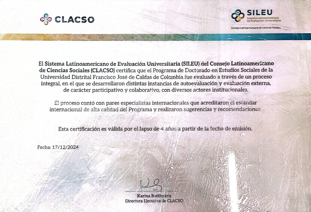 El Doctorado en Estudios Sociales (DES), de la Universidad Distrital Francisco José de Caldas, presenta una propuesta académica e investigativa orientada bajo la perspectiva epistemológica de la convergencia crítica así como por la emergencia de nuevos campos teóricos y metodológicos que se relacionan directamente con las problematizaciones del presente y la configuración de campos de posibilidad que permitan desarrollar procesos de investigación propositivos y que consoliden el campo de los Estudios Sociales más allá de lo disciplinar