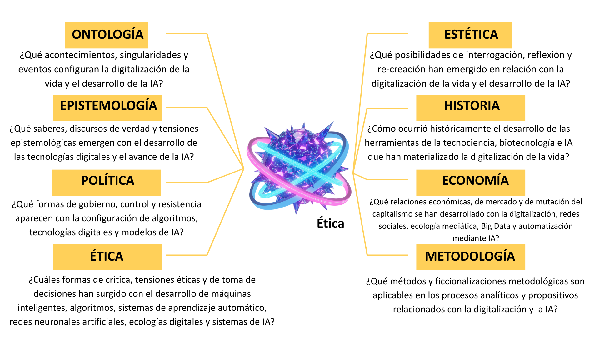 Objetivo y Enfoque de la Línea de Investigación Esta línea busca analizar críticamente cómo la tecnología se vincula directamente con la configuración de modos de existencia, formas de vida y nuevas relaciones de poder, basadas en elementos como el algoritmo, las redes neuronales artificiales y otras formas de organización social a partir de las complejas interacciones entre sujetos y tecnologías. Se decanta por una base conceptual post-humana, centrada en la tensión entre la multiplicidad rizomática (Deleuze y Guattari, 2015) como resistencia, y la multiplicidad arbórea construida por la simulación digital, con una propuesta política para la invención de nuevas resistencias en el contexto de las tecnociencias.