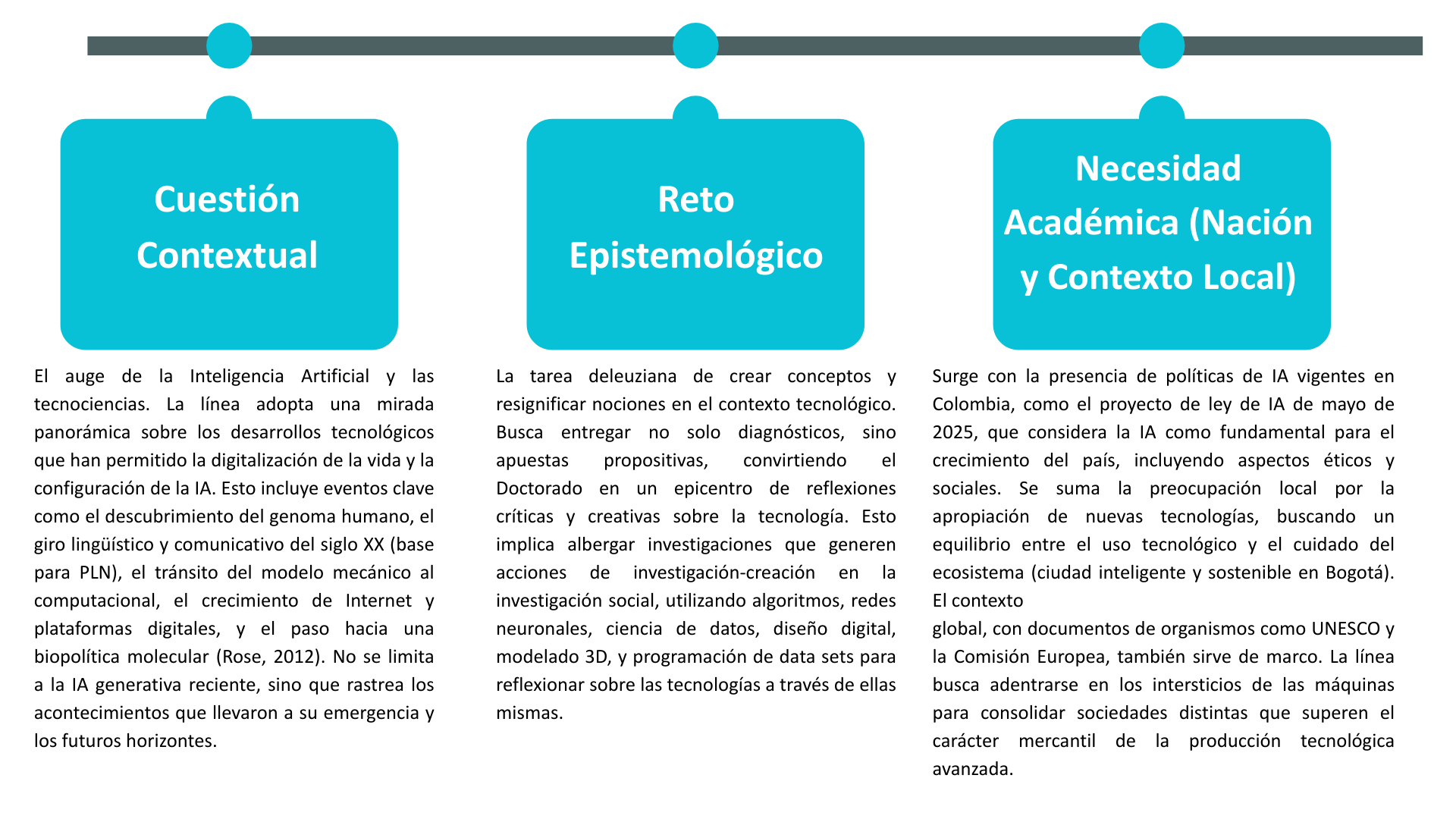 La línea se concibe como una respuesta a la invitación de Braidotti (2017) sobre la necesidad de nuevos modos de análisis ante las paradojas tecnológicas y la consolidación de un proceso de convergencia de conceptos, saberes y prácticas que permitan diversas miradas sobre cómo las tecnologías digitales y tecnociencias configuran nuevos modos de lo social y cultural. Supera la inter y transdisciplina al abordar puntos de encuentro donde se cruzan condiciones que hacen posible no solo la IA, sino la vida artificial como principio inherente a los desarrollos tecnológicos actuales. Se plantea como un trabajo de investigación en reflexión y actualización permanente, rastreando las mutaciones que operan en el funcionamiento de las "máquinas abstractas" (Deleuze y Guattari, 2015).